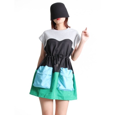 TWOTWINSTYLE Womens Dresses Hit Color Patchwork Drawstring Pleats Sleeveless Mini Dresses 2024