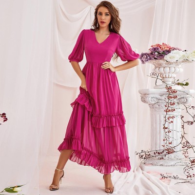 2024 Customized Fashion V-neck Quarter Sleeve Flowy Ruffle Dress chemise femme longue High Waist Elegant Women Casual Dresses