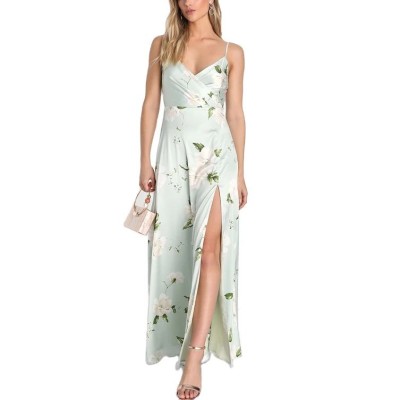 Hot selling fashionable women's dress custom light green printed flower strap dresses summer satin A-line maxi dress