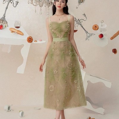 Women's 2023 Summer New Green High Waist Temperament Mesh Sling Dress