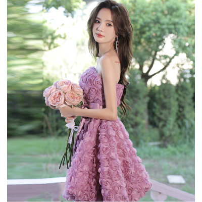 ZX-977 Summer Dress Women Custom Hot Strapless Solid Pink Elegant Gown Romantic Floral A Line Tulle Mini Evening Dress For Girls