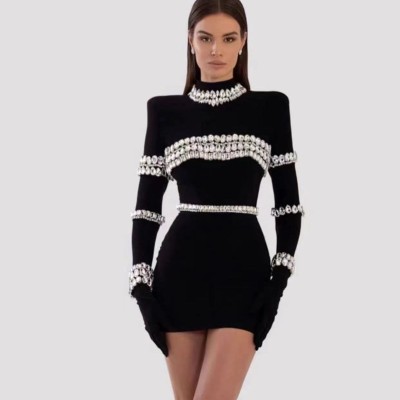 Wholesale High-quality Rhinestone Design Long-sleeved Bandage Dress Black Classic Solid Color Handmade Casual Formal